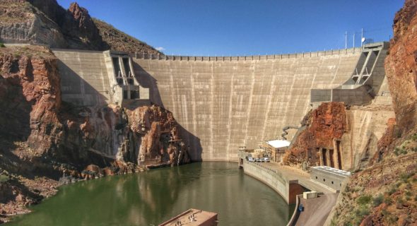 Aan het eind van de Apache trail kwamen we bij de Roosevelt dam. Dit is wat metselwerk betreft de grootste dam van de wereld. Hij werd baksteen voor baksteen opgebouwd tot de indrukwekkende hoogte van 93 meter. In 1996 werd daar nog een stukje bij gedaan tot 119 meter.
