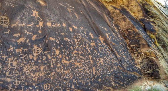 Onze eerste stop was bij Newspaper Rock. Meer dan tweeduizend jaar lang hebben de Fremont en de Pueblo Anasazi er indrukwekkende taferelen in de rots gekerft. De Navajo indianen noemen deze plek ‘de rots die verhalen vertelt’. Zelf vonden we het leuk om gezien te hebben, maar al vrij snel hebben we onze weg vervolgd.