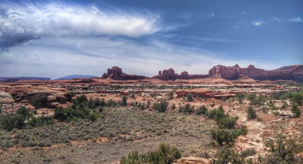 In Canyonlands NP hebben we weer een hike uitgezocht: de Slickrock Foot Trail. Tijdens deze hike van maar liefst 4 kilometer zagen we in de verte een flinke regenbui hangen. Deze bui werd alleen maar groter en later hoorden we ook onweer. Maar gelukkig was er geen thunder on the mountain bij ons. We hebben wel een nat pak gehaald, maar dat kwam door het zweet.