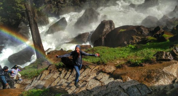 We hebben de hike gedaan naar de Vernal en Nevada watervallen. Het was een pittige route van 12km met een stijging van 600 meter. De route naar boven hebben we over de ‘mist trail’ gelopen. Na enige tijd werd het ons duidelijk waarom deze route zo heet: de waterval zorgde voor heel veel waterdruppels in de lucht waardoor het mistig werd. Dit zorgde er ook voor dat we tot op onze onderbroek kleddernat waren geworden. Het leek af en toe of we in de stromende regen liepen.
